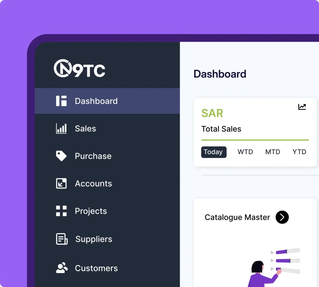 N9TC ERP is designed for Saudi businesses looking for a powerful, user-friendly, and locally compliant ERP solution. Automate processes, reduce errors, and make better decisions — all while ensuring VAT and ZATCA compliance.